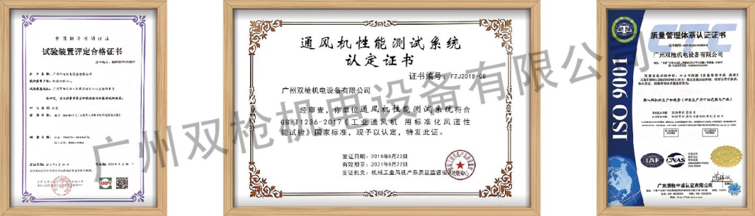 廣州雙槍機電設備有限公司按國家GB/T1236-2017标準建立了通風機性能檢測中心,2015年6月通過國家
